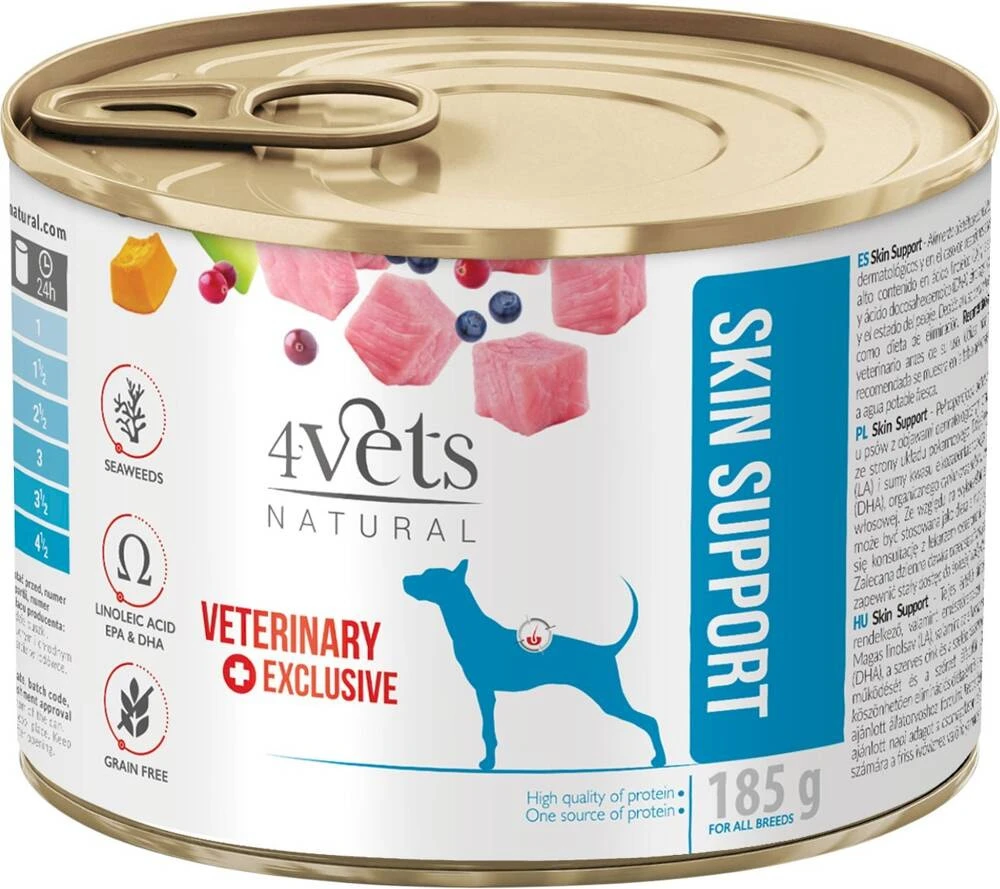 Développé selon les recommandations modernes en matière de nutrition animaleLe régime vétérinaire 4vets Skin Support est un aliment complet pour chiens recommandé en cas de symptômes dermatologiques et de réactions indésirables du système digestif. Grâce à sa teneur en acides gras oméga-3 et -6, en zinc organique et en sélénium, il soutient la fonction cutanée et l’état du poil. En raison de l’utilisation d’une seule source de protéines animales, il peut être utilisé comme régime d’élimination. L’alimentation joue un rôle important dans le contexte de l’état de la peau et du pelage d’un chien, qui reflète sa santé et son état. Il est donc nécessaire de suivre un régime équilibré, de limiter le contact avec les agents nuisibles et les allergènes alimentaires afin de maintenir l’aspect correct de la peau et de ses créations (pelage, griffes).