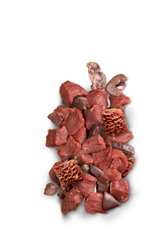 Composition : 68,0 % de viande bovine (viande, poumon, pis, foie, cœur, panse) ; 31,0 % de bouillon ; 1,0 % de minéraux.