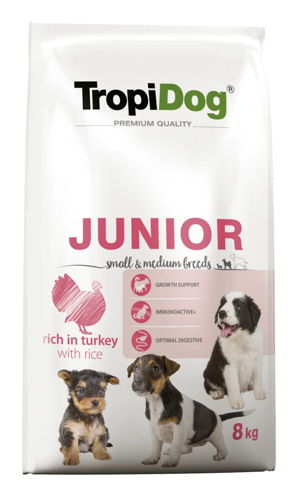 TropiDog Premium Junior Petites et Moyennes Races est un aliment premium riche en saumon avec du riz, destiné aux chiots de petites races (de 2 à 10 mois) et de races moyennes (de 2 à 12 mois) ainsi qu’aux chiennes enceintes et allaitantes. Contient des protéines de dinde hautement digestibles ainsi que des légumes, des fruits et des algues varech (Ascophyllum nodosum). Le développement du cerveau des chiots et la maturation du système nerveux sont favorisés par la lécithine et les acides gras oméga-3 provenant de l’huile de saumon et des graines de lin.